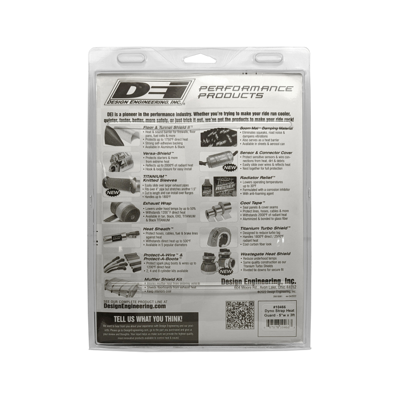 Protects Dynamometer tie-down straps from burn-through caused by exhaust exit heat Made of a hi-temp resistant aluminized mylar material Withstands 500°F direct / 2000°F radiant heat Easily slips over dyno tie down straps 36 in. long x 5 in. wide