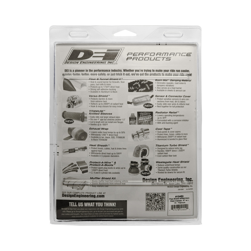 Pipe Shields solve the problem of needing spot heat protection for exhaust pipes and components. Extreme heat can rob power and potentially damage engines, transmissions, hoses, and sensitive electrical components. DEI, a market leader in thermal protection, has introduced a revolutionary advancement in pipe shield technology that greatly outperforms Mylar-backed glass fiber shields. DEI's Titanium Pipe Shield combines the high heat tolerance of DEIÂ's proprietary LR fiber technology with a unique rivet-based clamp shield design to improve heat dissipation and cooling. Glass fiber shields can begin to fail at 900°F with the Mylar outer material cracking and flaking off. DEI's Titanium Pipe Shield provides heat protection up to 1350°F. LR fiber technology is a two-ply material. The outer layer is made from pulverized and stranded lava rock into a proprietary tightly woven weave for durability and strength. The inside material is made of a special high temperature resistant fabric (89% silica) designed to withstand 350 degrees more heat than glass fiber. This proprietary fiber technology combined with DEI's unique shield standoff bracket design provides an air gap between the shield and pipe that together provides the maximum potential for cooling and heat dissipation. With the strategic placement of DEI's Titanium Pipe Shield near transmissions, brake lines, floorboards, body panels, diesel exhaust stacks or motorcycle pipes, radiant heat can be controlled for maximum protection and performance. Other uses include isolated areas such as sections of the exhaust pipe after the collector, an area that can heat transmission fluid, or along the path of an exhaust system in proximity of gas tanks, differentials and rear facias. The shield is designed for multiple automotive applications as well as marine, powersports, diesel and industrial applications where heat dissipation and thermal control is needed.