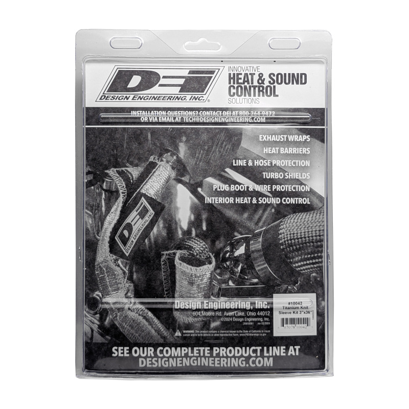Titanium Knitted sleeves are available in different precut lengths and by the foot sizes. They have a maximum temperature rating of 1800°F with a continuous rating of 1382°F. Perfect for larger exhaust pipes as they can expand up to 1.5 times normal diameter allowing to install over flanges and sensor threads. You can cut to length and simply roll the ends. Protect components and keep heat from transferring into the cabins. Titanium Knit Sleeve, 36 in. finished length for 3 in. tube. Includes ties and tool.