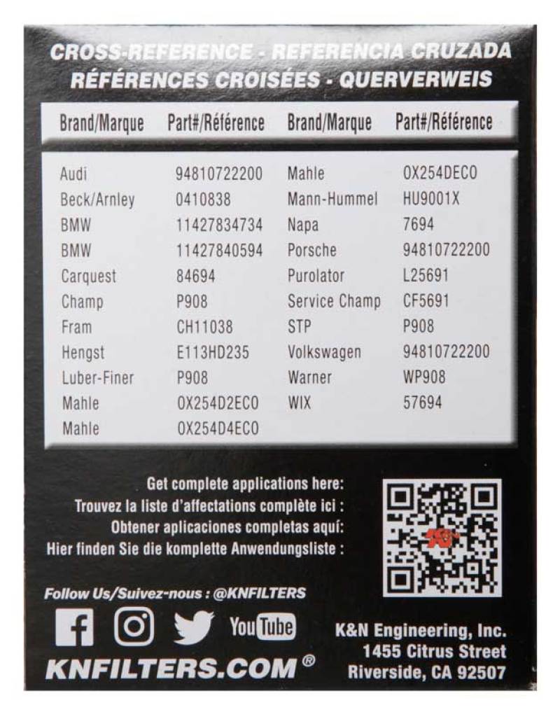 K&N Cartridge Oil Filters are designed to satisfy the needs of racers and engine builders as well as the average vehicle owner who wants the best oil filter available. K&N cartridge oil filters trap harmful contaminants while the filter's construction allows for high oil flow rates. All K&N oil filters are manufactured to meet stringent engineering standards. They are covered by a limited warranty to be free from defects in materials and workmanship when installed and replaced using engine and equipment manufacturer's recommended service intervals.