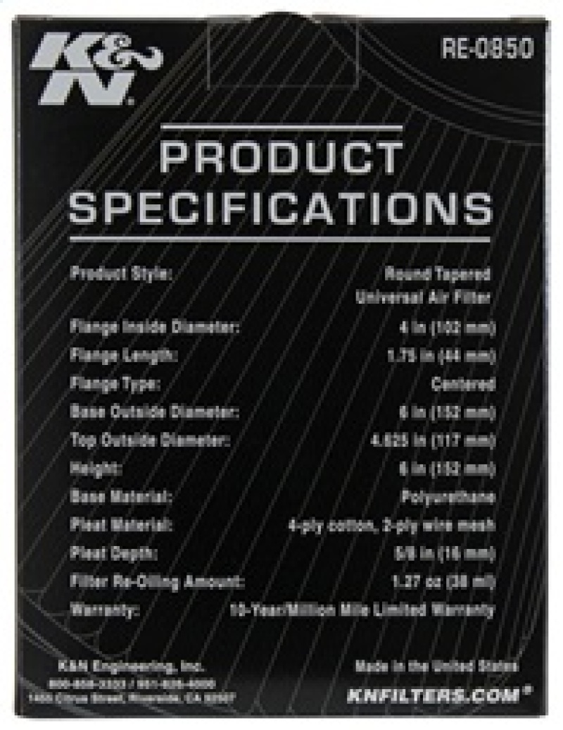 K&N's Universal Air Filters are designed and manufactured for a wide variety of applications including racing vehicles, radio-controlled cars, generators, snowmobiles, tractors, and other applications. Regardless of the angle or offset diameter of the air intake, there is probably a K&N Universal air filter for your equipment. All filters are constructed with ultra-strong molded pliable rubber flanges which absorb vibration and allow for secure attachment and can also be stretched for up to 1/16 of an inch (1.5mm) to fit in-between sizes. K&N universal air filters are washable and reusable.