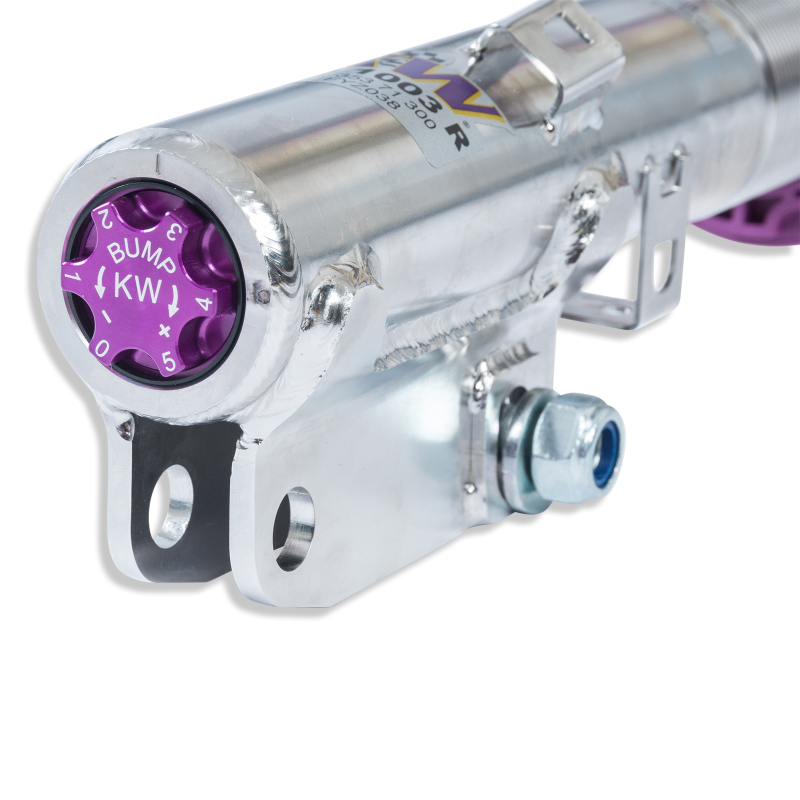 Cutting-edge motorsports technology for more performance on the road. Like every suspension product developed by KW automotive, the suspension manufacturer, and manufactured in Germany, the KW V3 Coilover suspension kit also provides a significant plus in safety reserves in road traffic. Thanks to the chassis with its high-quality dampers, springs, and elastomer spring elements, pitching and rolling movements during load changes such as evasive maneuvers, cornering, acceleration, and braking are significantly reduced. The braking distances are also shortened. Thanks to improved support and feedback, drivers not only feel safer but driving in everyday life becomes even safer. With compression and rebound stage damping, that can be set separately and independently of each other, the damper setup can be customized to your personal driving preferences or vehicle changes such as weight, tire characteristics, or altered vehicle rigidity. True performance optimization is only possible with this unique, patented system. For example, this al lows the compression damping force to be increased and get more grip from the tires, to improve cornering behavior and reduce squat without simultaneously altering the rebound stage damping which is optimally matched to the spring rate, a scenario which results in reduced grip and the associated loss of performance. The KW V3 coilover kit is the ideal tool for performance-oriented drivers and experienced tuning enthusiasts who place a strong emphasis on the overall performance of their suspension. The Variant 3 features patented TVR-A and TVC-A technology that provides separately adjustable rebound and compression damping. The extensive adjustment range of the independently configurable rebound and compression make it easy to directly influence the steering behavior, directional stability, grip and handling characteristics for confident and repeatable results at the limit of driving dynamics.