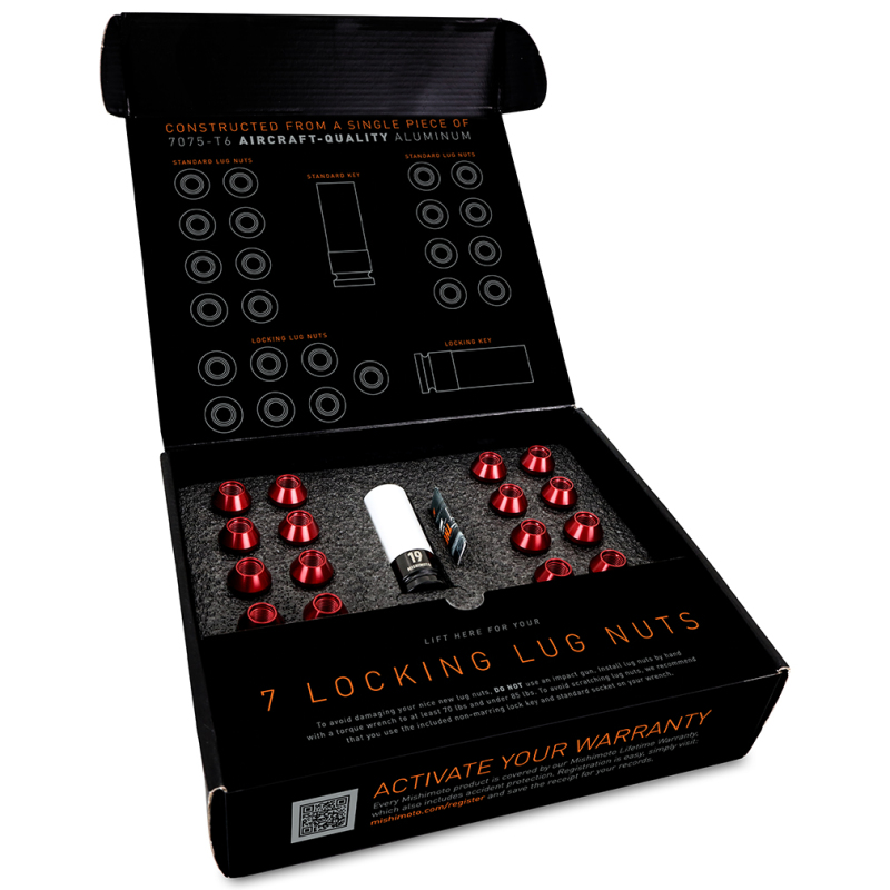 Upgrade your vehicle’s styling with a set of Mishimoto Aluminum Locking Lug Nuts! These 1/2-in x 20 aluminum lug nuts are constructed from a single piece of 7075-T6 aircraft-quality aluminum and are the perfect complement to both stock and aftermarket wheels. These lug nuts weigh in at just 0.8 oz (22.68 g) each and provide a lightweight yet durable alternative to your stock lug nuts. Each kit includes 16 standard lug nuts, 7 locking lug nuts – one for each wheel and three for rear-mounted spares, one non-marring socket, and one non-marring key. These non-marring sockets are lined inside and out with soft plastic to protect both your wheels and your Mishimoto lug nuts.----These lug nuts utilize an open-ended design with a total length of 50 mm, conical seat to fit many OEM and aftermarket wheels, and a knurled end for speedy installation. These Mishimoto aluminum locking lug nuts fit vehicles with 1/2-in x 20 wheel studs and come in a variety of finishes including black, blue, neo-chrome, silver, or red. As with all Mishimoto products, these lug nuts include the Mishimoto Lifetime Warranty.